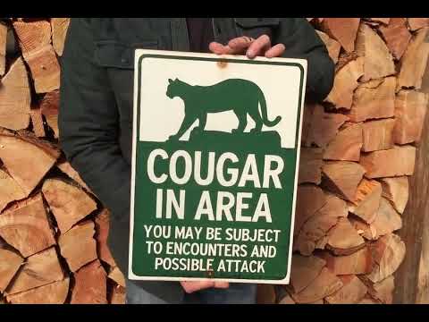"Cougar in area: You may be subject to encounters and possible attack" warning sign, in green on white. Based on similar signs seen in national parks.