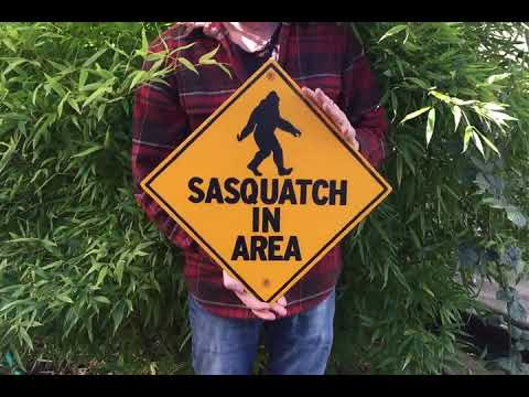 "Sasquatch In Area" warning sign, in black and yellow. I am a big fan of sasquatch/bigfoot imagery and lore, while not believing in the big guy myself. While selling signs at a farmers market, I met someone claimed to have been chased by a sasquatch, a bold claim! Where are the female sasquatches that's what I want to know.